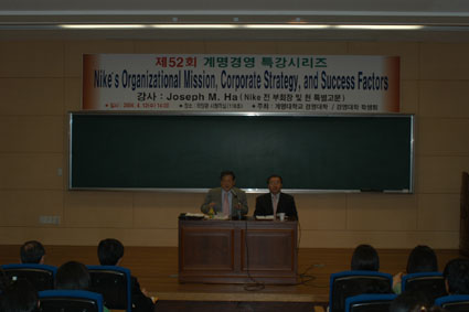 이번 강연에 초청된 서용달(모모야마 대학 명예교수·경영대학 특임교수)교수와 Jaseph M. Ha(Nike 전 부회장 및 특별고문)씨는 각각 ‘일본에 있어서의 신회사법 제정’과 ‘Nike's Organizational Mission, Corporate Stratgy, and Success Factors'를 주제로 강연했다.