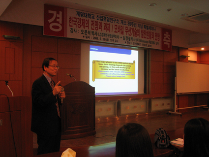 심정필(미국 Mississippi 주립대학교·교수)박사와 오문석(LG경제연구원·상무이사)박사가 첨단산업인 모바일 기술의 발전 전망과 한국경제의 발전 방향에 대해 설명했다. 이날 강연에서 심정필 박사는 모바일 기술에 대해 “소비자가 모바일 TV에 거는 기대를 만족시켜줘야 한다”고 말했다. 한편 산업경영연구소는 우리대학의 원가계산용역업무, 계약금액조정업무, 경영종합지도업무 등을 담당하고 있다.