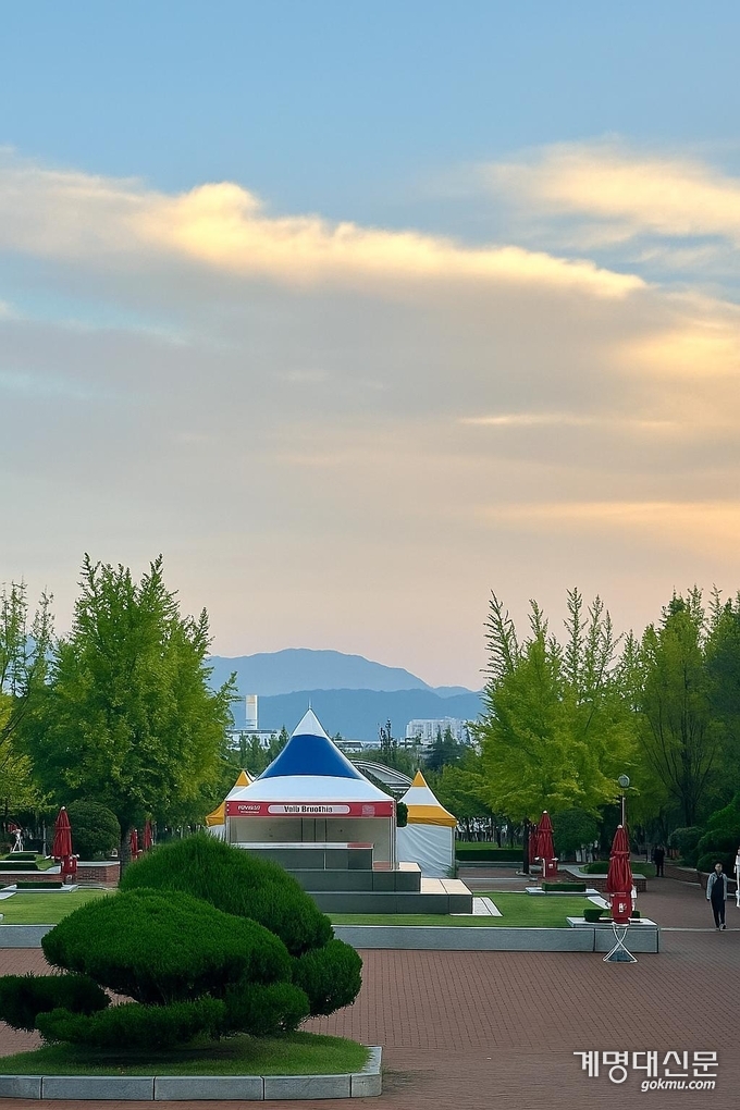 도서관에서 공부를 마치고 나오는 길, 눈앞에 펼쳐진 풍경이 눈길을 끌었다. 해가 서서히 기울며 하늘은 부드러운 분홍빛과 푸른빛이 섞여 있었다. 멀리 보이는 산은 고요했고, 그 아래로는 학과 부스 천막들이 자리해 있었다. 바람이 살짝 불어 나뭇잎이 흔들리고, 풍경을 보는 순간 하루의 피로가 사르르 녹았다. 공부로 가득했던 마음이 잠시나마 여유로워지고, 이 풍경이 수고한 나에게 보상을 주는 듯했다. 그래서 나는 이 장면을 사진으로 담아두었다.