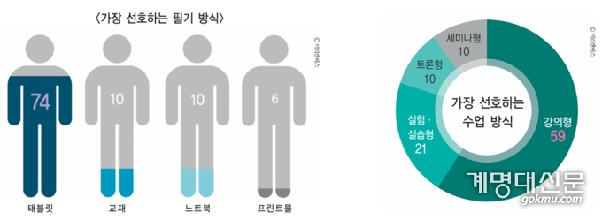 지난 3월 21일부터 4월 1일까지 실시한 ‘선호하는 필기 및 수업 방식’ 조사 결과, 가장 많이 사용하는 필기 방식은 ▲태블릿 PC(74건), ▲교재(10건), ▲노트북(10건), ▲인쇄물(6건) 순으로 나타났으며, 그 이유로는 ▲자료 활용이 편해서(55건), ▲필기와 정리가 편해서(28건) 등이 있었다. 이는 학습 방식에서 효율성과 접근성을 중시하는 경향이 반영된 결과로, 디지털 기기를 활용한 학습 환경이 보편화됐음을 보여준다.