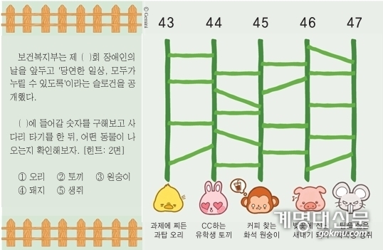 보건복지부는 제 ( )회 장애인의 날을 앞두고 '당연한 일상, 모두가 누릴 수 있도록'이라는 슬로건을 공개했다.