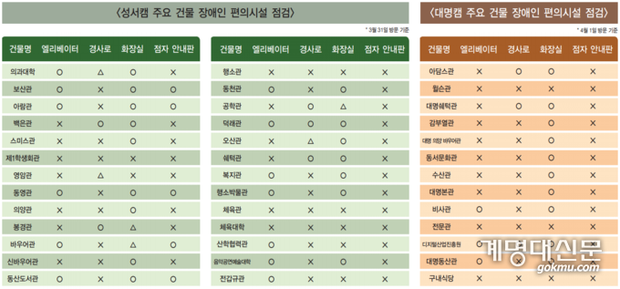 우리학교는 ‘교육연구시설’ 중 ‘학교(특수학교를 포함하며, 유치원은 제외한다)’에 해당해 주출입구 접근로, 전용 주차구역, 전용 화장실, 점자블록 등을 의무적으로 설치해야 한다. 그러나 캠퍼스 내에는 1998년 장애인등편의법이 시행되기 이전에 지어진 건물이 대부분이라 해당 기준이 충분히 반영되지 않은 건물도 일부 확인됐다. 우리학교 주요 건물의 장애인 편의시설 점검 결과는 아래 표를 참고하면 된다.